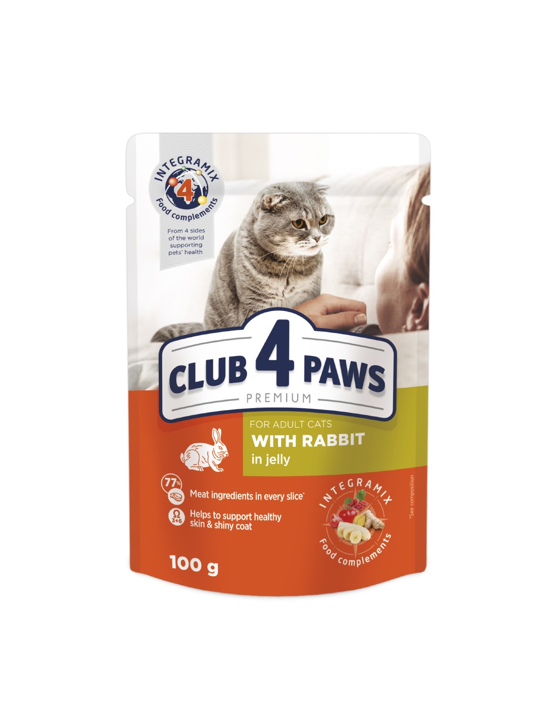 Кролик в желе для взрослых кошек Влажный премиум-рацион содержит 77% мясных ингредиентов в кусочках (в том числе из кролика 9%). Он обогащен, комплексом Омега 3+ Омега 6 для здоровой кожи и блестящей шерсти и формулой INTEGRAMIX для общей поддержки здоровья вашего любимца Достоинства: - 8,5/5 – сбалансированная формула для ежедневного кормления - для взрослых кошек в возрасте от 1 года - мясные ингредиенты на первом месте в составе - смесь токоферолов как натуральный антиоксидант - Витамины D3, E, B1, B5, микроэлементы и аминокислоты - Омега 3+ Омега 6 для здоровой кожи и блестящей шерсти - Формула INTEGRAMIX: сушеные томаты, имбирь, боярышник и бананы – для общего здоровья любимца - без искусственных ароматизаторов и красителей Состав: 77% мяса и продуктов животного происхождения в кусочках, в частности из кролика 9%, злаки, экстракты растительного белка, минералы, масла и жиры (масло из лосося 0,22%), фрукты (банан 0,1%, боярышник 0,03%)*, овощи (помидоры 0,11%)*, имбирь* 0,005%. Добавки (на 1 кг (кг) корма): витамины: D3 (3а671): 200 МЕ, Е (3а700): 16 mg (мг), В1 (3а821): 1 mg (мг), кальция Д пантотенат (3а841): 1 mg (мг), фолиевая кислота (3а316): 0,226 mg (мг), холин хлорид (3а890): 3,1 g (г); микроэлементы: цинк (3b604) 4,2 mg (мг), марганец (3b503) 3,12 mg (мг), йод (3b201) 0,64 mg (мг), селен (3b801) 0,2 μg (мкг); аминокислоты: таурин (3а370): 467 mg (мг), глицин (2b17034): 5,6 g (г); пищевые красители. *Натуральные ингредиенты, высушенные. Питательная ценность (аналитические компоненты) корма: сырой белок 8,5%, сырой жир 5%, сырая зола 2,5%, сырая клетчатка 0,3%, влажность 82%, кальций 0,35%, фосфор 0,3%, омега-3 жирные кислоты 0,1%, омега-6 жирные кислоты 0,33%. Энергетическая ценность 100 g (г) корма: 347,43 kJ (кДж) (83,04 kcal (ккал)). Срок годности: 24 месяца с даты производства. Хранить в сухом месте при температуре от +6 ºС до +30 ºС. Корм в открытой упаковке хранить в холодильнике не дольше 48 часов. Порция корма обязана быть комнатной температуры. Корм необходимо вводить в рацион постепенно (по крайней мере, в течение первых 5-ти d (дней)). Обеспечить животному постоянный доступ к чистой питьевой воде. Индивидуальные нормы кормления могут изменяться в зависимости от возраста, породы, уровня активности и среды обитания животного. Комбинируйте кормление с сухими рационами CLUB 4 PAWS для взрослых кошек. 1. Производитель/импортер в Украине: ООО "Кормотех", Львовская область, Яворовский район, с. Прилбичи, 81062, Украина, тел. 0 800 503 603. 13-20-38 PF. ТУ У 15.7-32673400-002 2. Производитель: ООО "Кормотех", ул. Пазангос, 2, г. Кедайняй, Кедайняйский район, Литва, утвержден ветеринарный номер предприятия: указан на упаковке.
