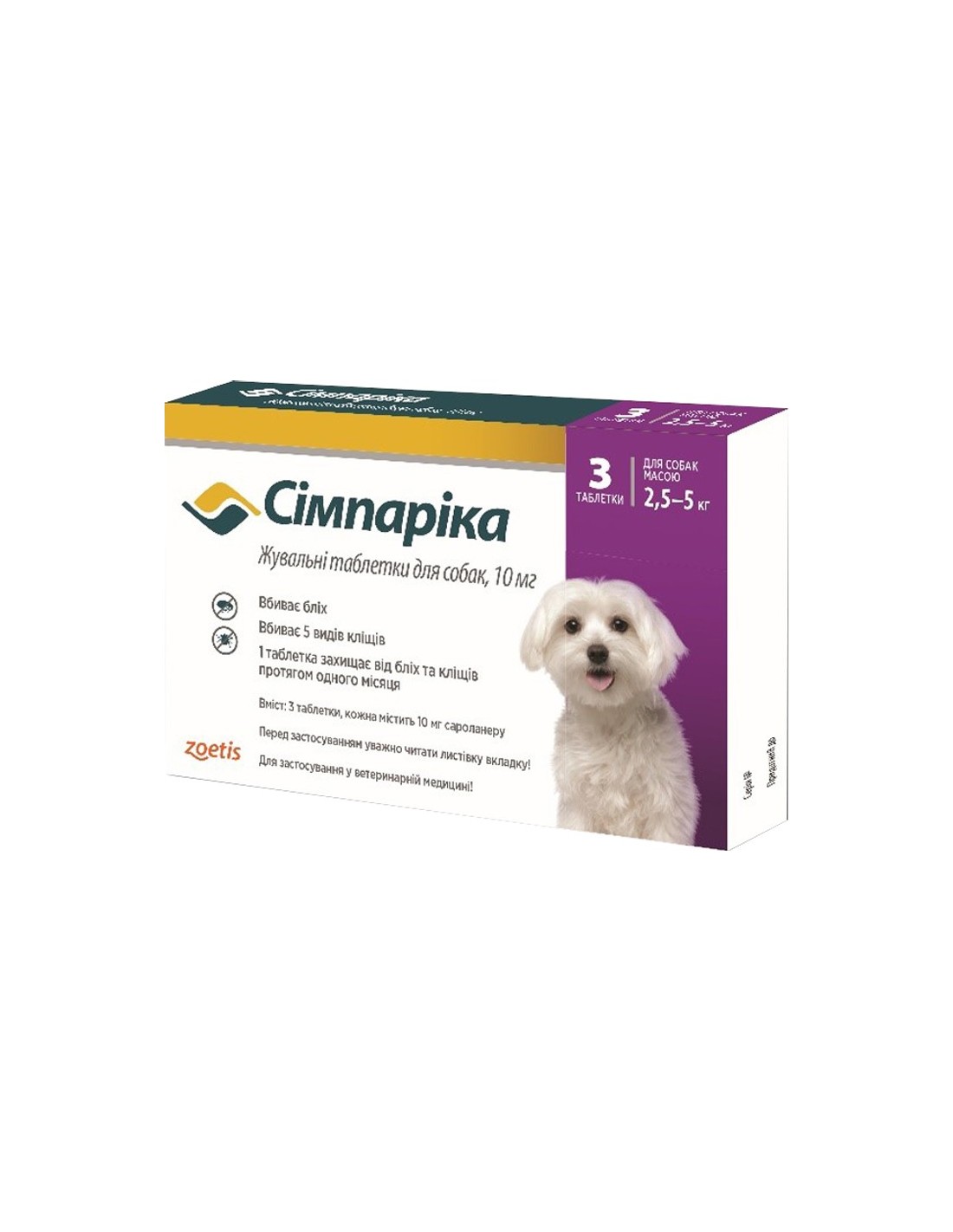 Жувальні таблетки Zoetis Simparica (Сімпарика) 10 мг проти бліх та кліщів для собак вагою від 2.5 до 5 кг 1 таб (без коробки)