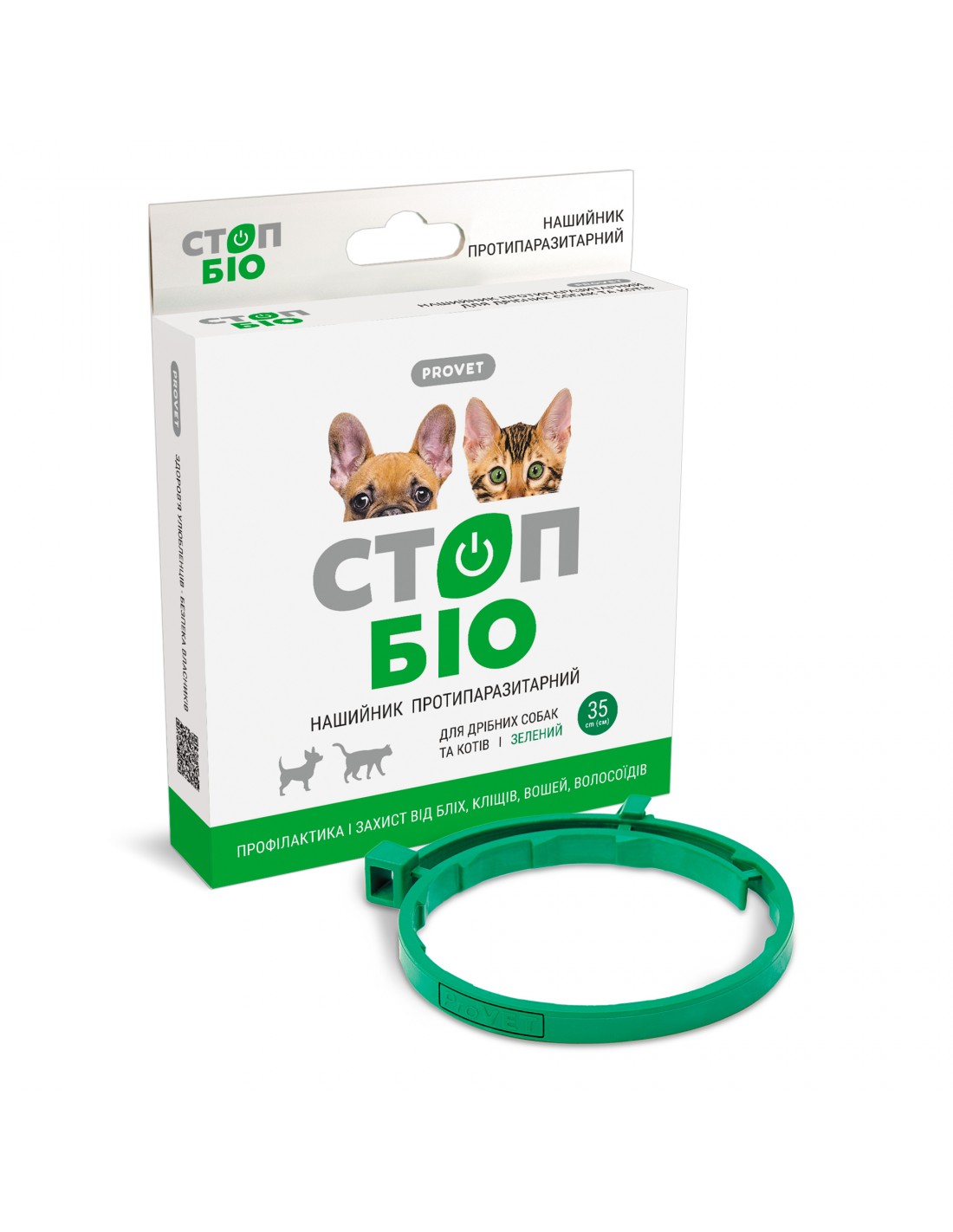 Нашийник STOP-БІО - засіб для профілактики і знищення бліх, волосоїдів, кліщів та інших ектопаразитів у котів та собак, який містить тільки природні компоненти (композицію олій). Постійне виділення природних репелентів з м’якої фактури нашийника - забезпечує захист тварини від паразитів до 3 місяців. Додатковий ефект- знімає свербіж, подразнення шкіри, покращує загальний стан шерсті та шкіри.