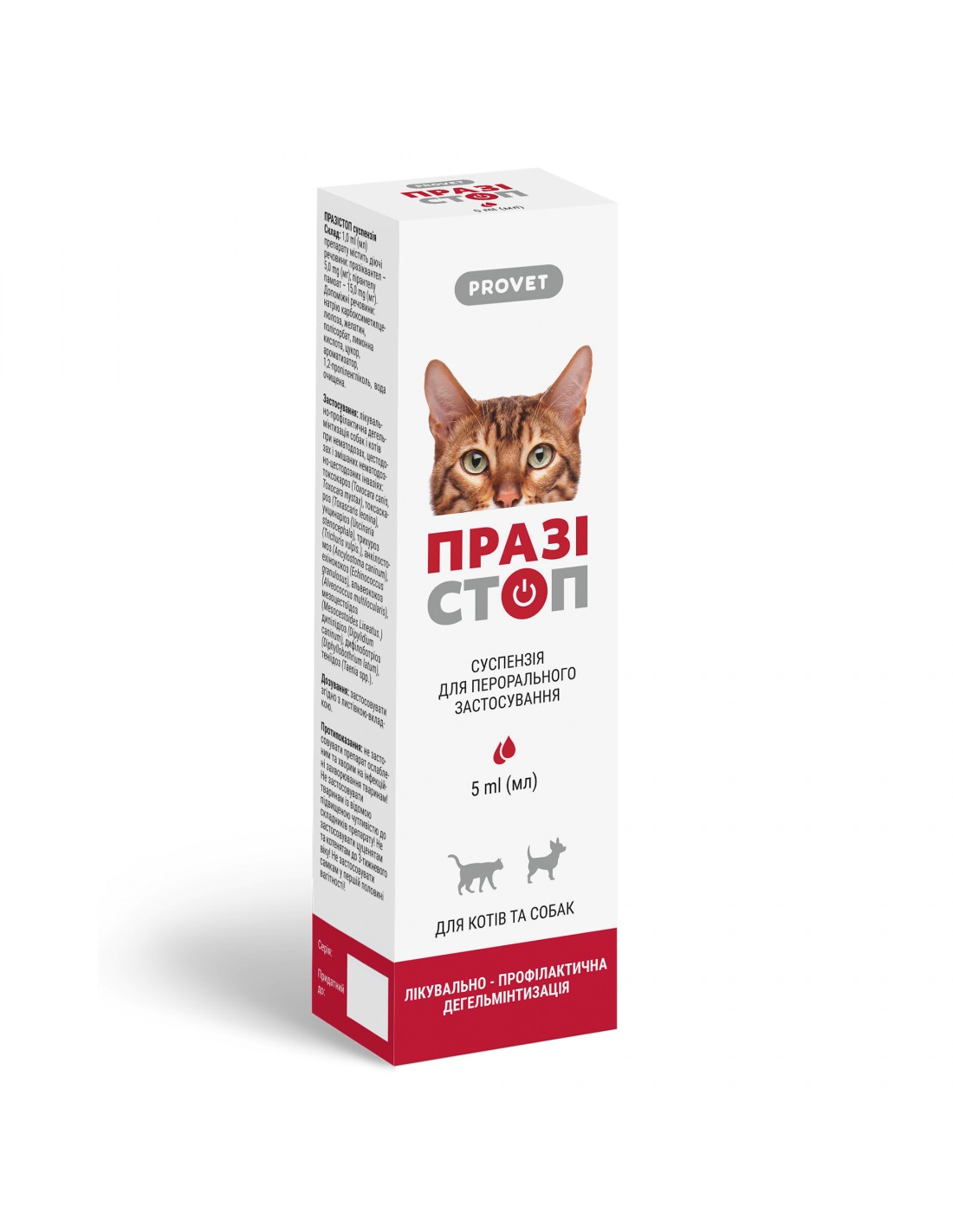 Спосіб застосування: Перед застосуванням збовтати! Препарат застосовують тваринам індивідуально, одноразово під час вранішньої годівлі з невеликою кількістю корму або вводять примусово на корінь язика за допомогою шприц-туби у дозі: котам (у т.ч. кошенятам), собакам (у т.ч. цуценятам) - 1 мл суспензії на 1 кг маси тіла тварини.